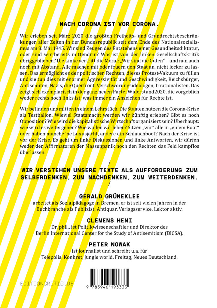 Wir erleben seit März 2020 die größten Freiheits- und Grundrechtsbeschränkungen in der Geschichte der Bundesrepublik. Wir legen mit unserem Buch die erste Veröffentlichung vor, die sich aus kritischer, linker Perspektive mit den Entwicklungen der letzten Wochen beschäftigt.